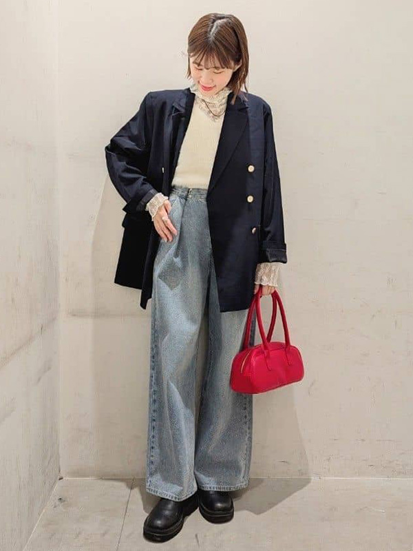 金ボタンがポイントになったネイビーのダブルジャケットは、きれいめコーデと相性抜群。フェミニンなブラウスにきれいめパンツのきちんと感のあるコーデに肩がけすれば、上品で知的なムードがプラスされます。かっちり感もあるので、オンなシーンにもぴったりです。