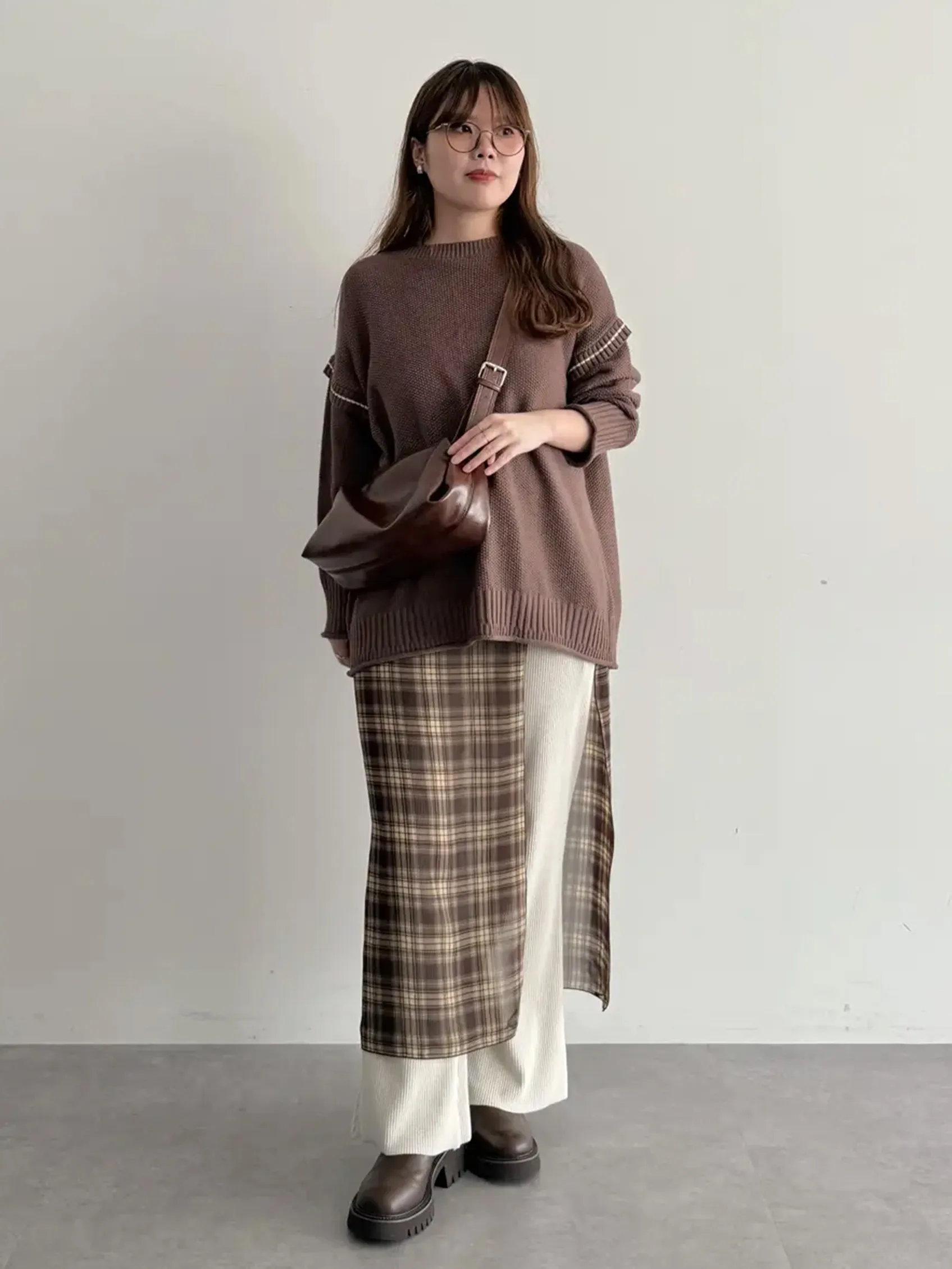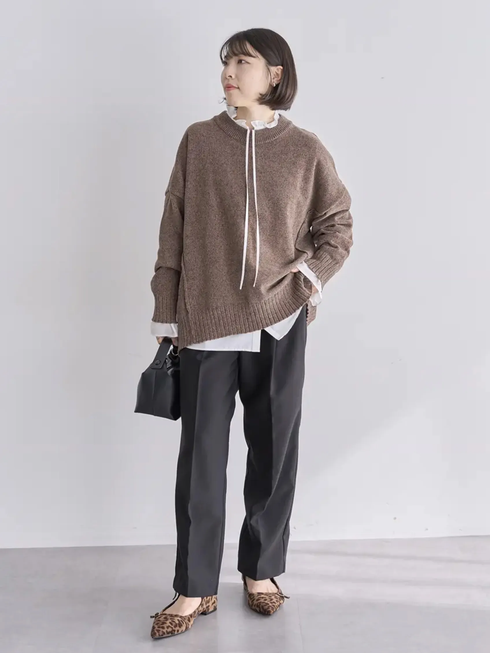 ブラウンのニットにブラックのパンツという落ち着いた色の組み合わせに、フリルカラーのシャツをレイヤードして遊び心を。ホワイトのインナーはシックなカラーとの対比が生まれ、メリハリ効果も。