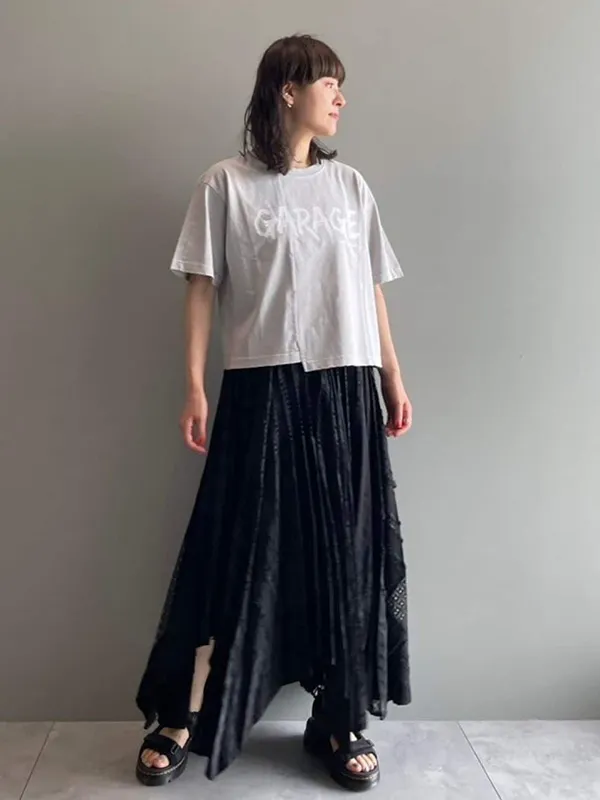 胸元のロゴやアシンメトリーな裾など、1枚で様になるTシャツはワンツーコーデでもおしゃれに装えるので魅力的。ショート丈なので、ボリュームのあるスカート合わせでもメリハリが生まれ、すっきり見せられます。辛口な色合わせでシャープさも際立つスタイルです。