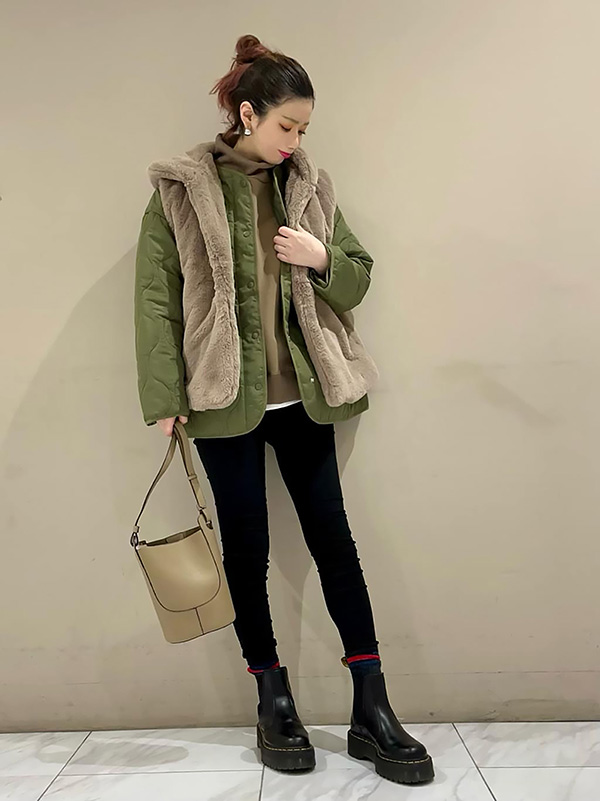支持率の高いキルティングジャケットは、長すぎない丈だとバランスが取りやすくてオススメ。ファーベストを重ねると、華やかさも暖かさも叶えられます。上半身にボリュームがあるので、ボトムスはスキニーをチョイス。ボリュームあるブーツで今年らしいシルエットに。