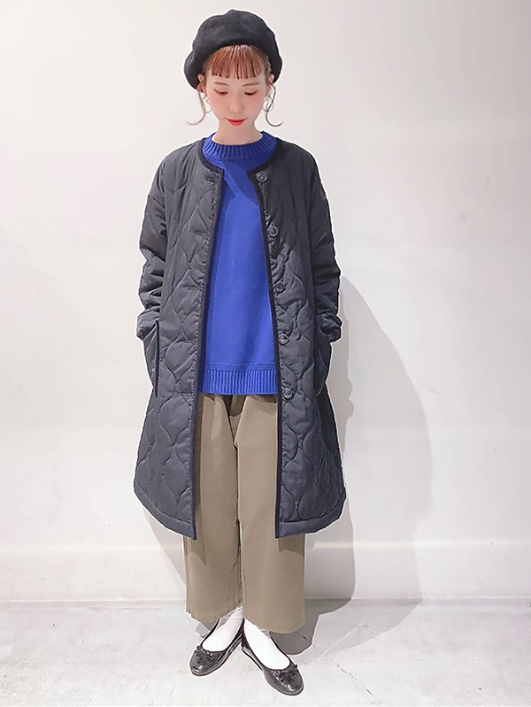 年々デザインが進化しているキルティングコート。ノーカラーやパイピングなど洒落見え要素がたくさん。ネイビーならシックに着られて大人向け。足元はラウンドトゥのパンプスでかわいらしく仕上げて。