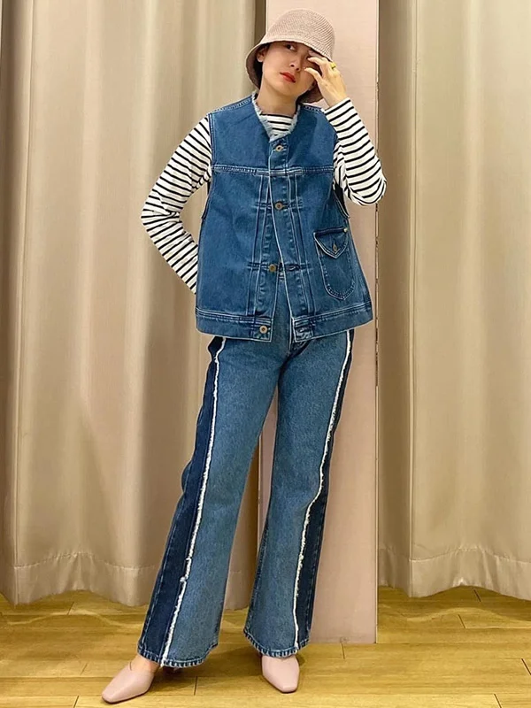 マンネリしがちなボーター×デニムもデニムonデニムで最旬スタイルに!羽織りとして、トレンドアイテムとして、春大活躍のベストはノーカラーで合わせやすく、腰回りも隠れる丈でスタイルアップも。遊び心のあるデニムパンツにはヒール靴で大人っぽさを。
