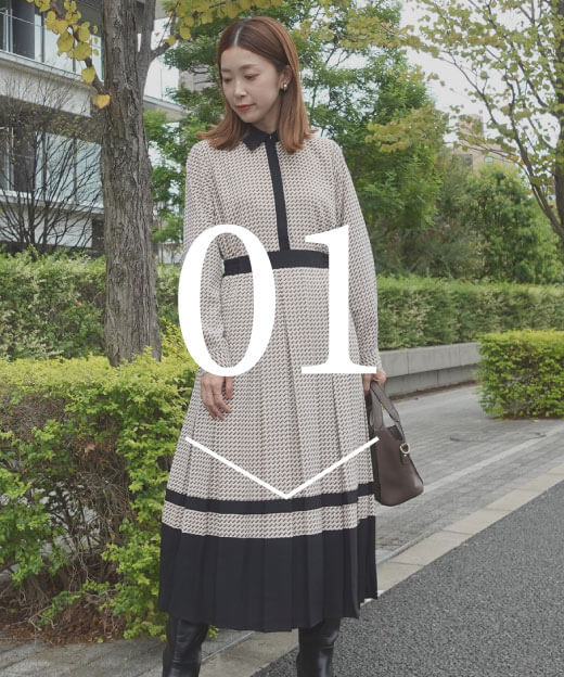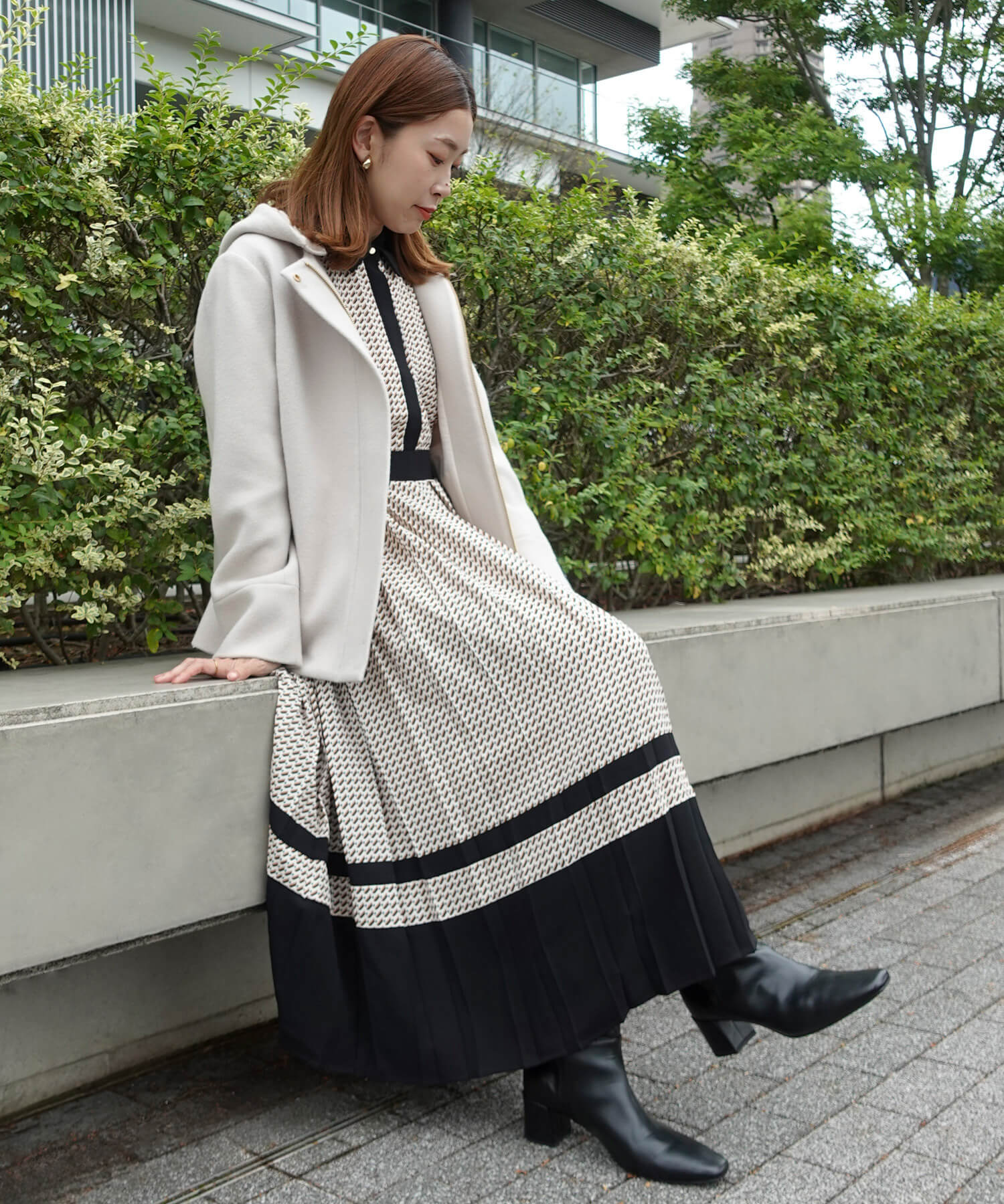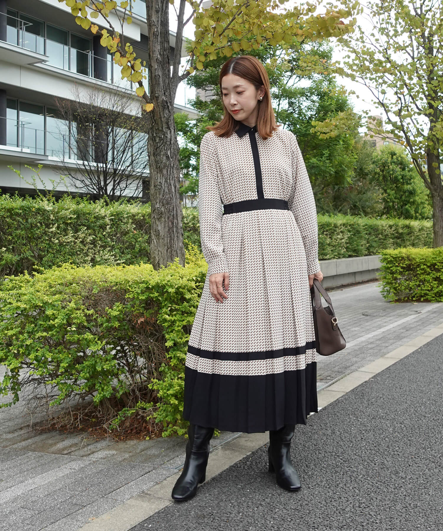 品よく見せる襟元とプリーツの切り替えが女性らしく、