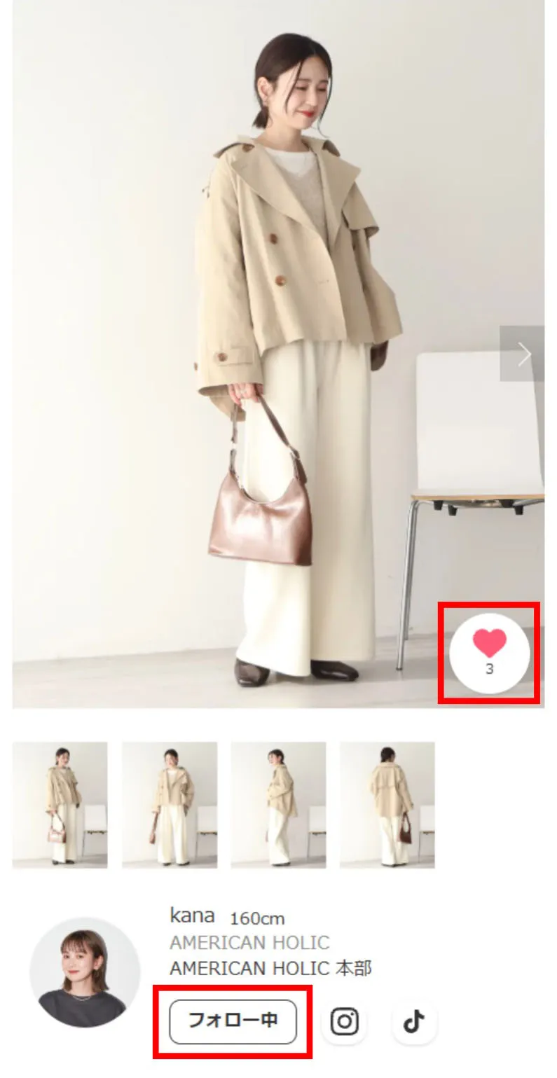 スタッフはスタッフプロフィール右部の「フォロー」から、スナップは写真内の♡ボタンからそれぞれ登録ができます。