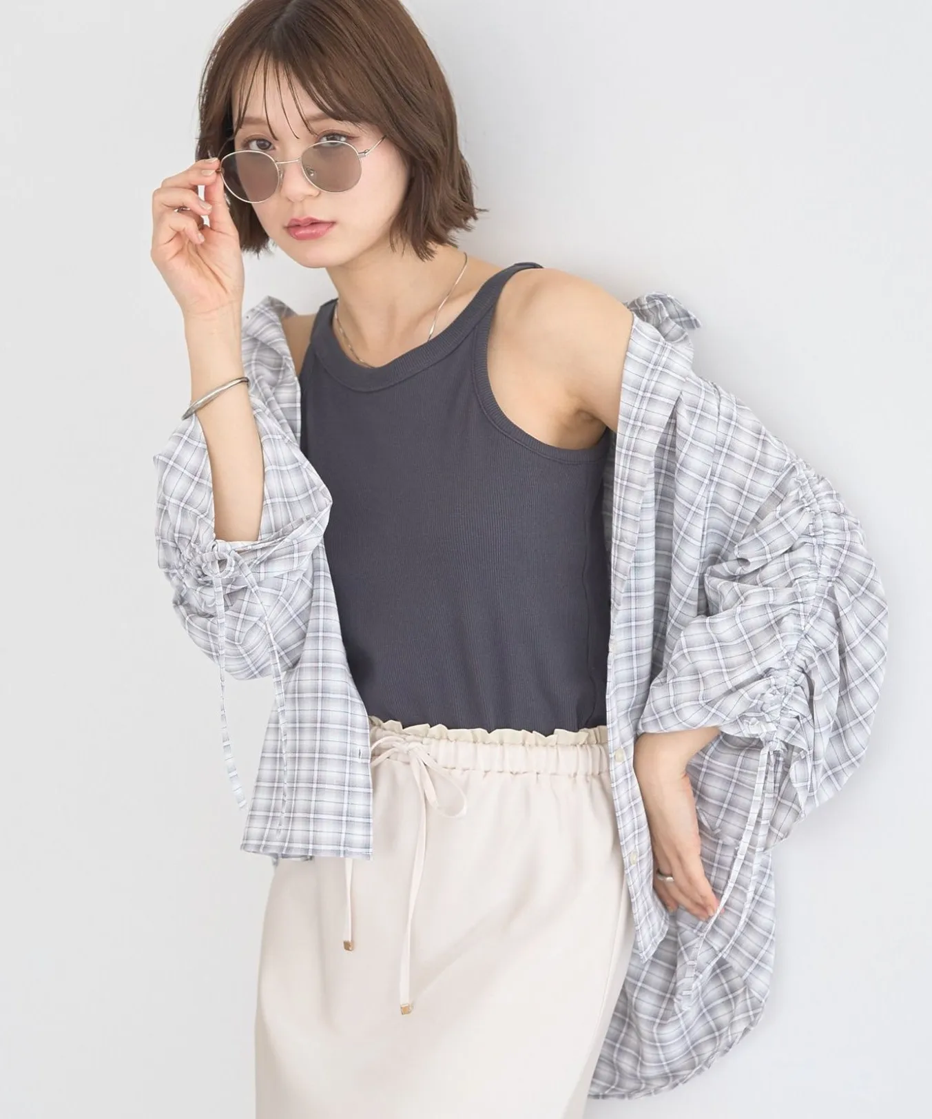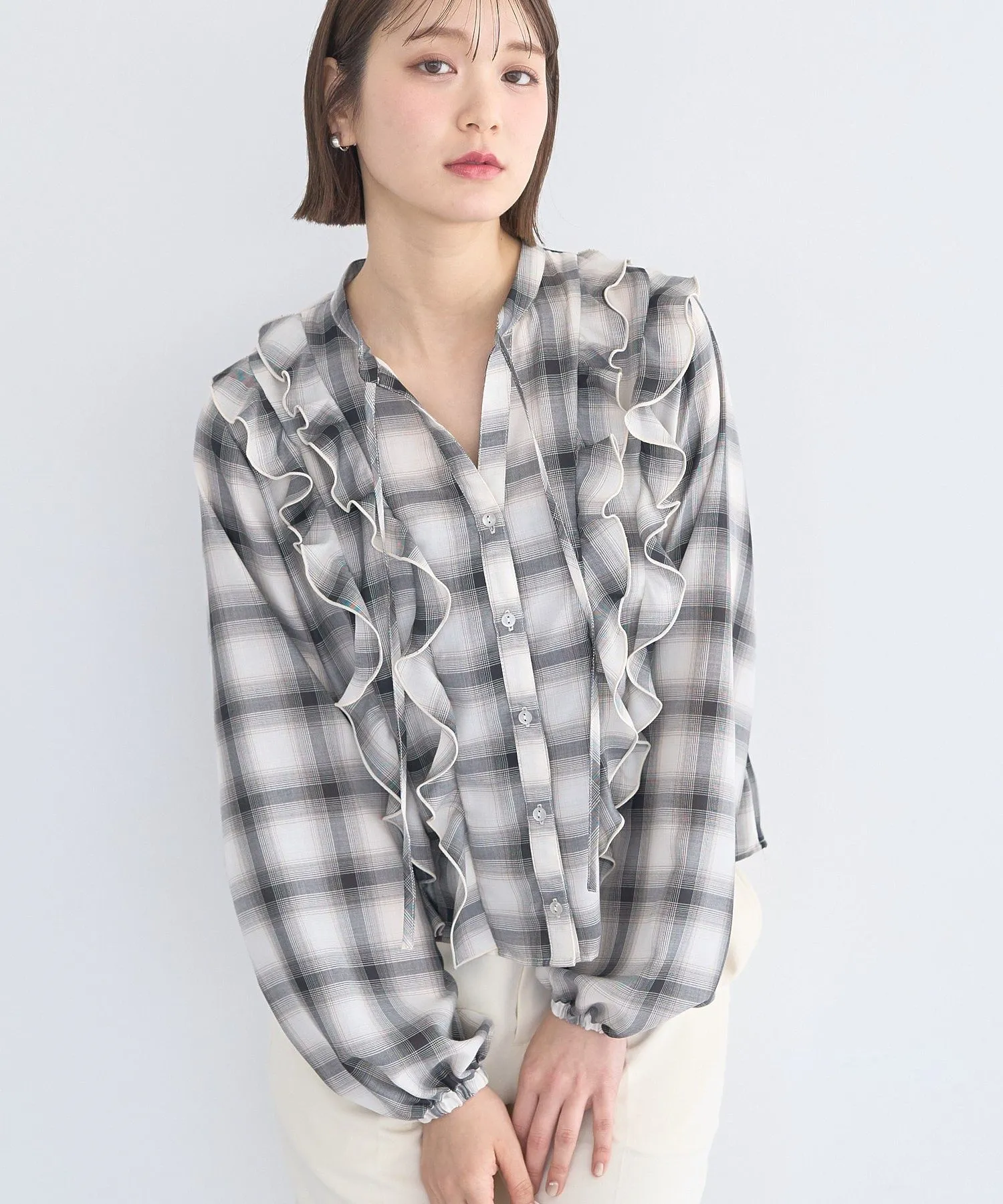 シャーリングスリーブチェックシャツ袖に施されたシャーリングデザインがさりげないアクセントをプラスします。