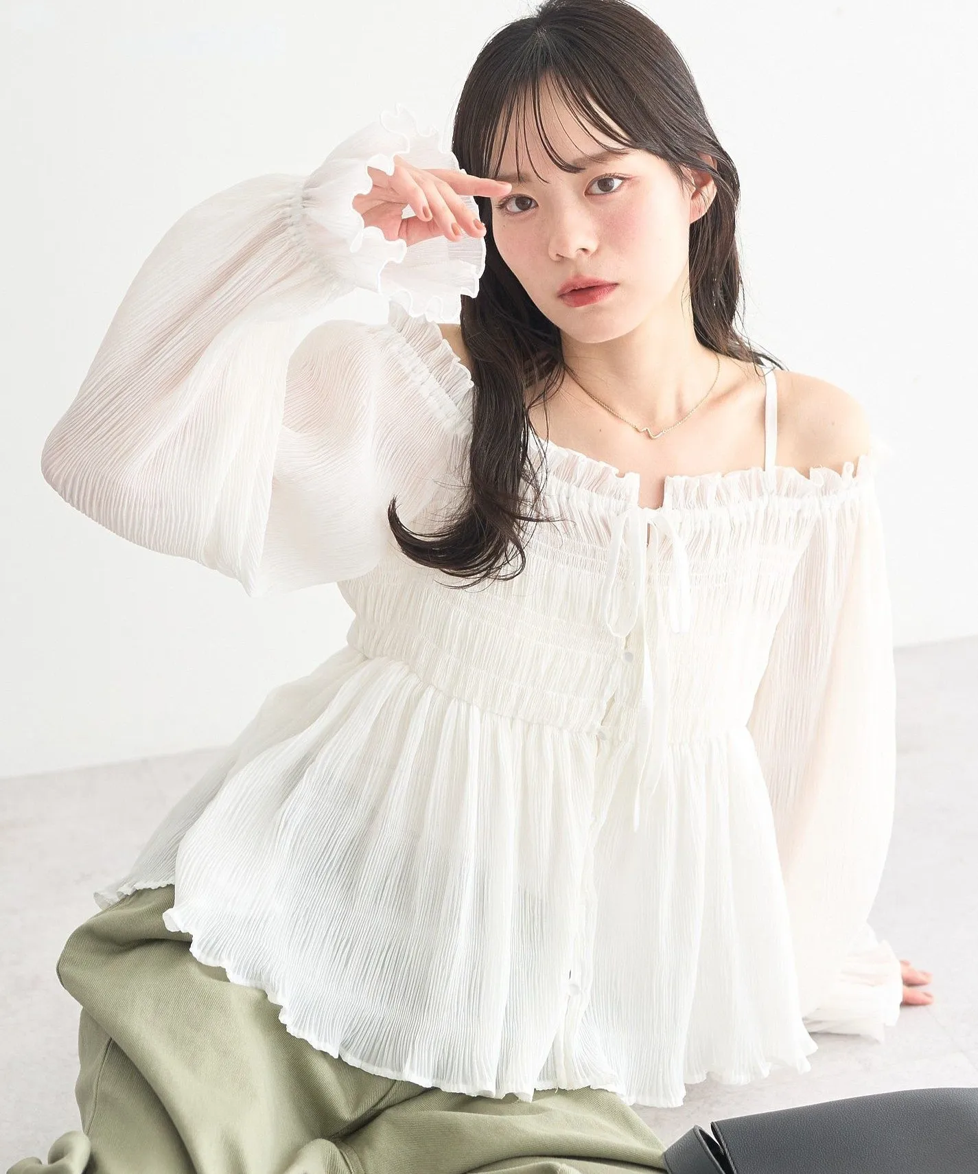 シャーリングフリルオフショルブラウス軽やかな素材感で動くたびにふんわりと揺れる華やかなブラウス。