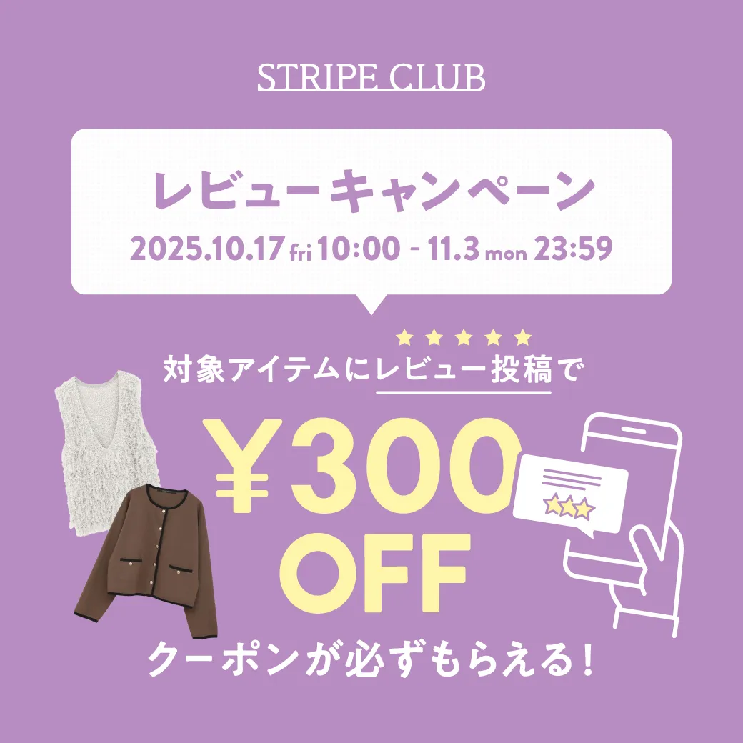 - ※オンラインストア「STRIPE CLUB」もしくは店舗でご購入いただいた対象商品にレビュー投稿いただいた方に、次回利用できるクーポンをプレゼントいたします。