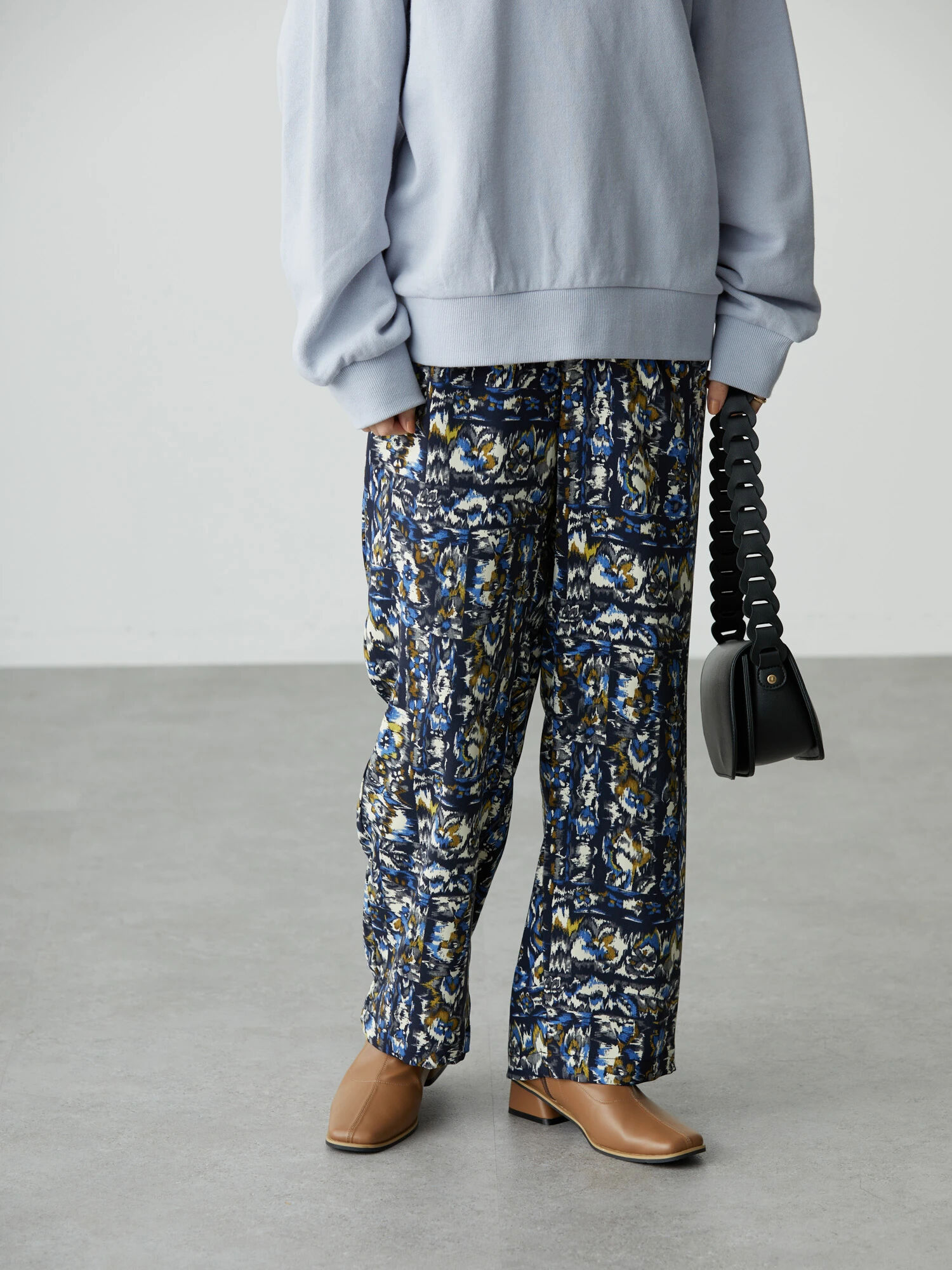 総柄のパンツが目を引くスタイリング。旬のざっくりニットやフラットシューズを合わせてこなれ感を演出!ワイドスリーブのホワイトニットで女性らしさも◎