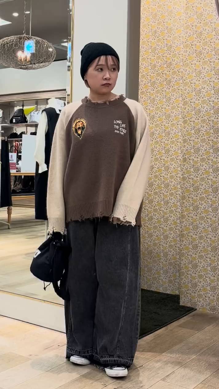 ライオン・キングのスカーをイメージした刺繍が印象的なVILLAINS/スカー/ダメージラグラン配色ニットは、トレンド感あふれるデザインとゆったりシルエットが魅力です。