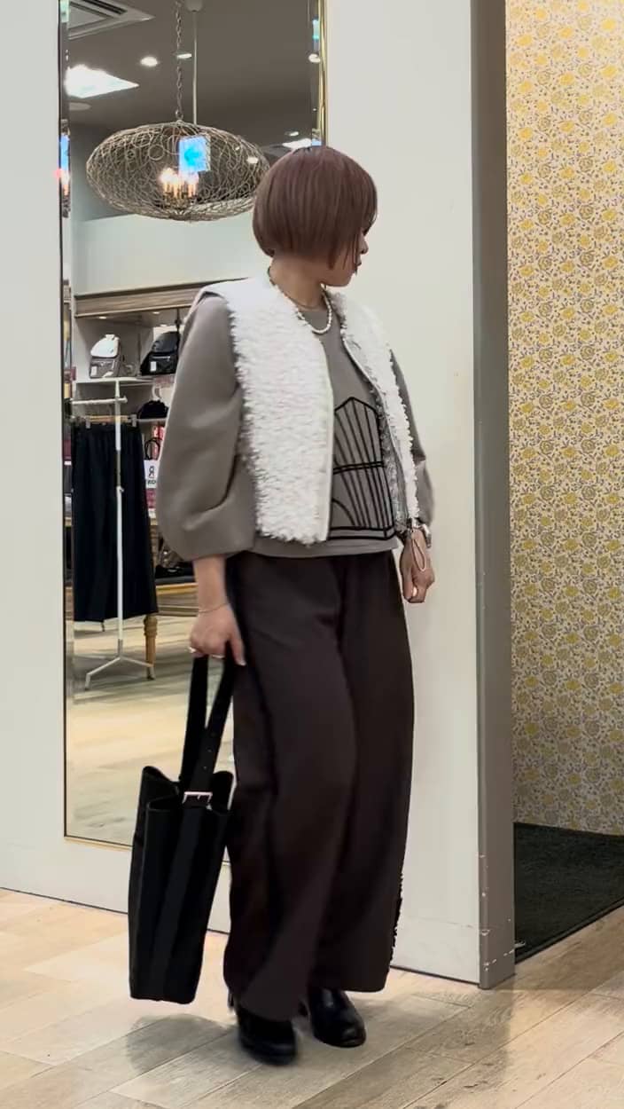 シーズンムード高まるフラッフィーベストと組み合わせて、奥行きのあるスタイリングも楽しめます。