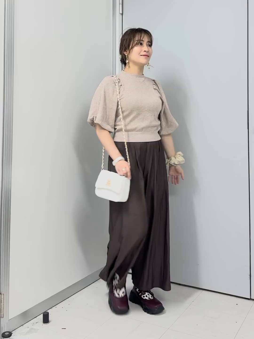 サテン生地が上品な光沢感のあるスカーチョパンツです◎ウエストが全てゴムになってるので脱ぎ着しやすいです!スカートのようなパンツなので優雅で履きやすいです♪