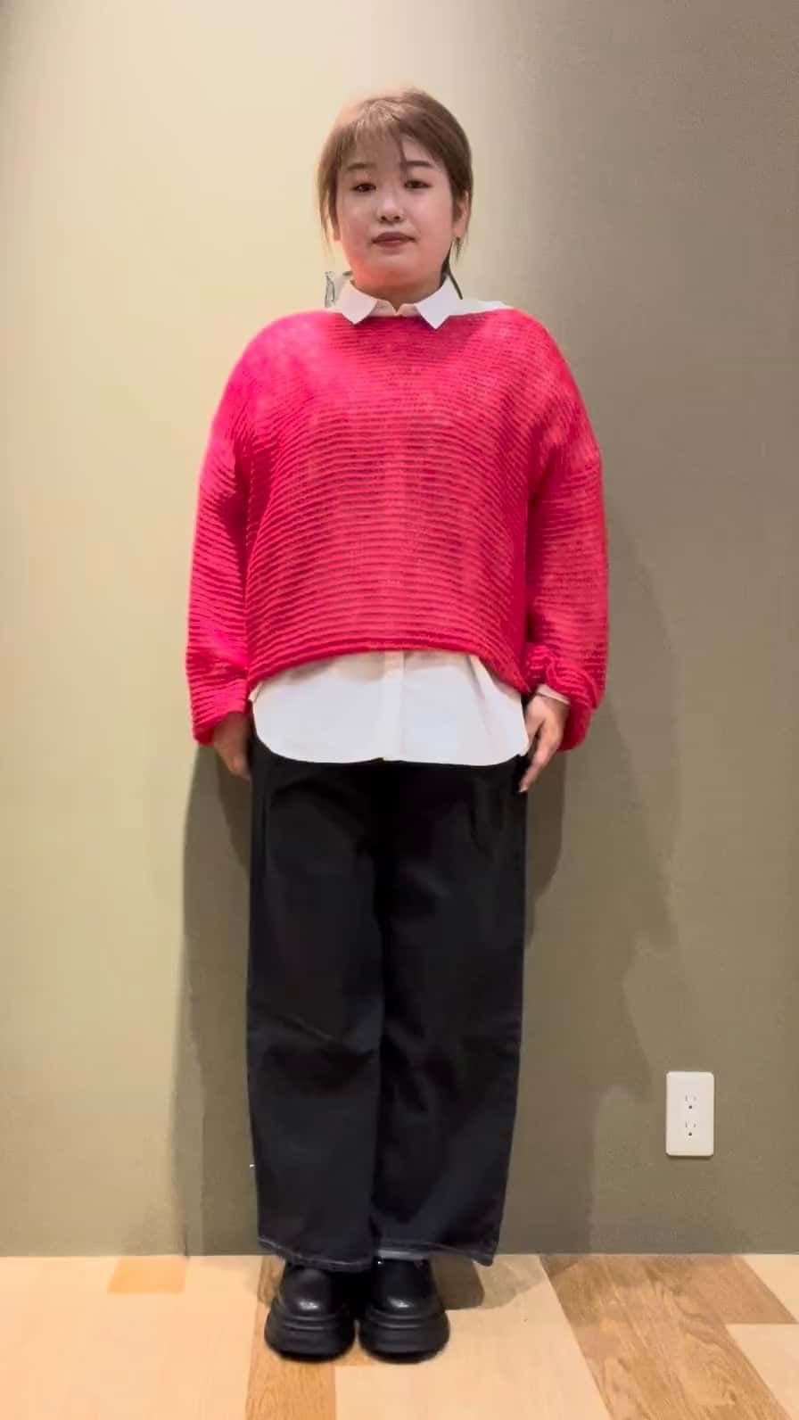 薄手のシアーニットです!薄手で軽い素材感なので、中のインナー次第で今からでも使えるニットになってます!首元も広めなのでスッキリ見えますし、レイヤードしやすいニットになってます