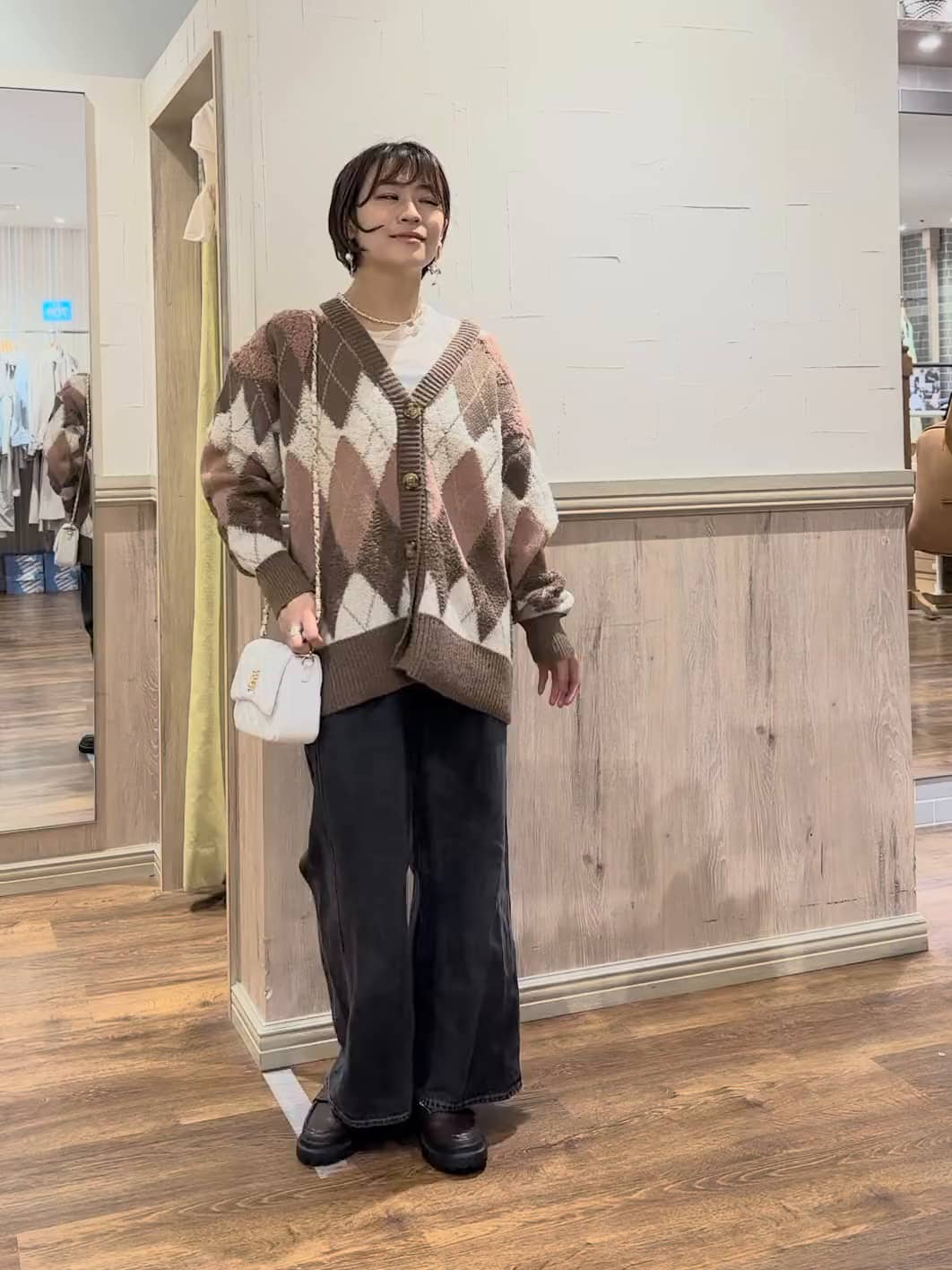 アーガイル柄と生地ループ編みが素敵なカーディガンです◎柔らかくて着心地もいいです♪お尻が隠れる丈の長さなので着やすいです✴︎。