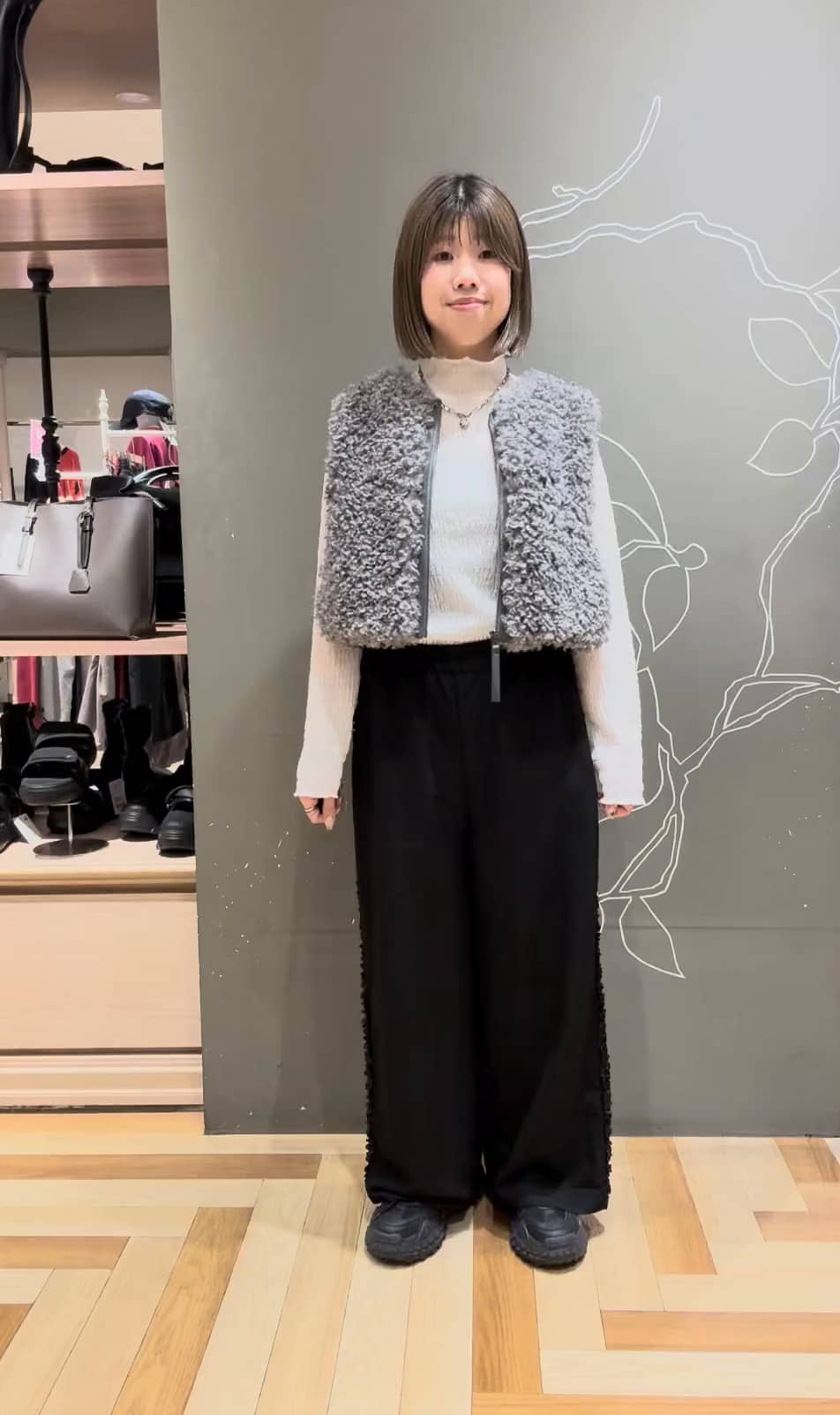 秋のコーディネートに欠かせないボア素材やフリルディテールを取り入れ、洗練されたスタイルを実現。