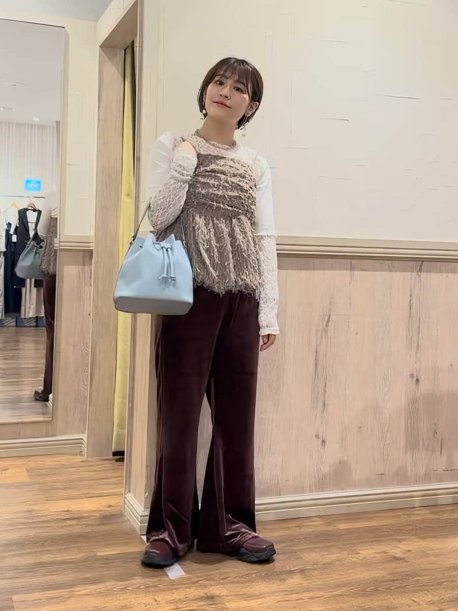 ベロア生地も素敵なフレアデザインのパンツです◎形はフレアパンツで足の細いところがくびれているのでボディーライン綺麗です♪ウエストが全てゴムになっていて脱ぎ着もしやすいです◎