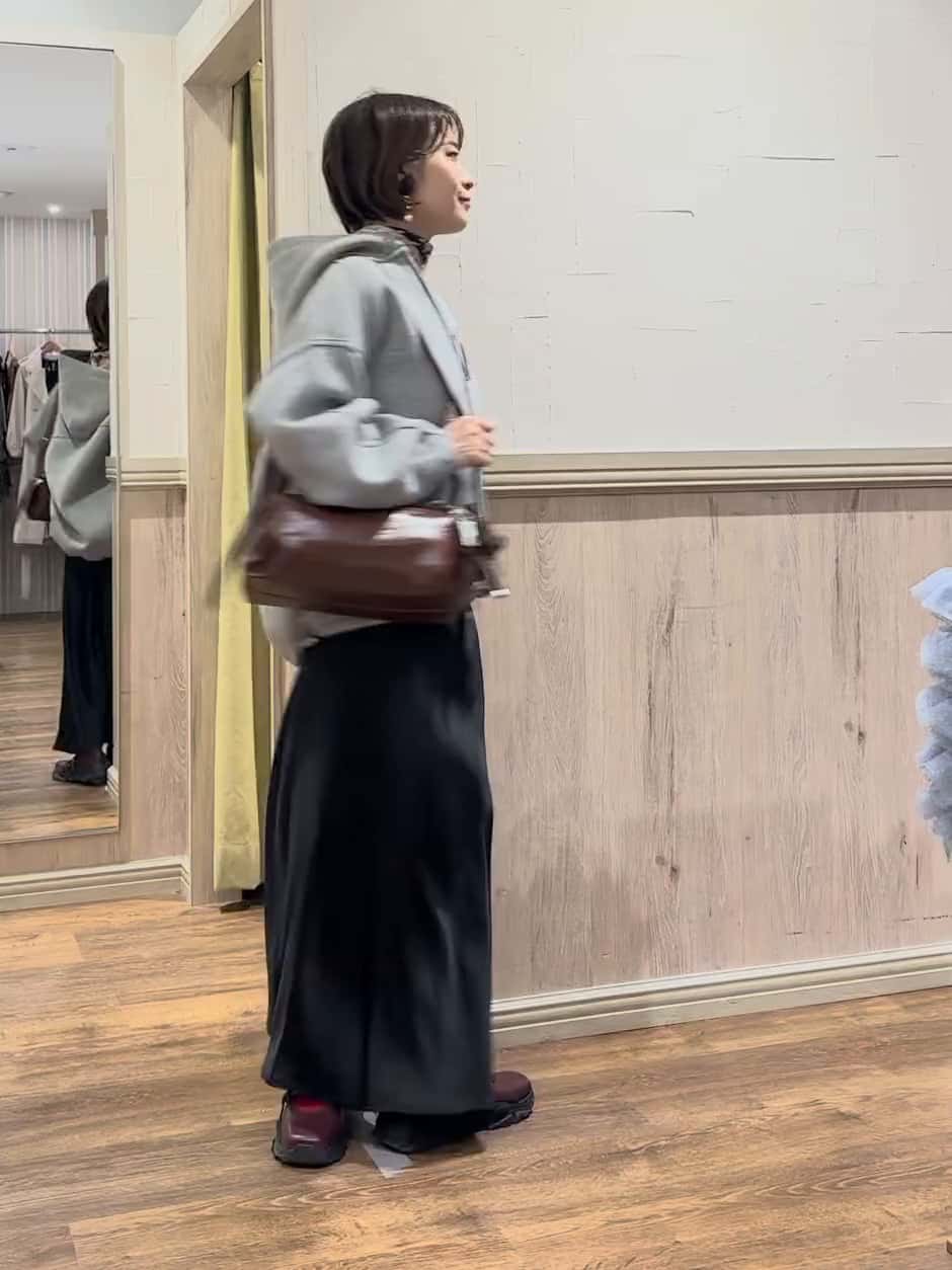 サテン生地が素敵なスカートです◎形はストレート寄りのフレアタイプでボディーラインを拾い過ぎないで綺麗です♪サラッとしているので着心地もいいです✴︎。