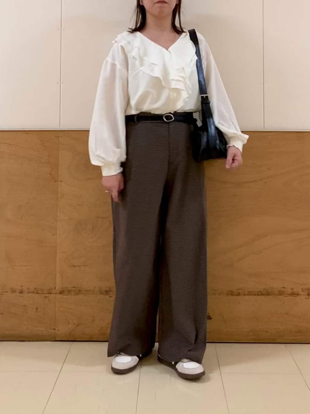 深めのタックが今年らしく、脚のラインを拾わないので体型をカバーしてくれます
